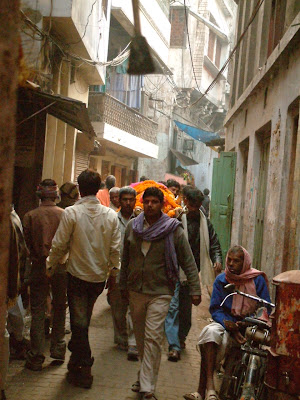 Varanasi has been the most colorful city in India so far. The city is one of the holiest places in India, where Hindu pilgrims come to wash away a lifetime of sins in the Gange river, or to cremate their loved ones. The life (and death) in Varanasi revolves around the ghats - the long string of bathing steps leading down to the western bank of the Gange. There are several "burning ghats" where bodies are cremated in public. We stayed in a local hotel right next to the Manikarnika ghat - the main burning ghat, and the most "prestigious" place for for a Hindu to be cremated. Dead bodies are handled by outcasts known as doms, and they are carried through the narrow alleyways of the old city to the river on a bamboo stretcher swathed in cloth. The corpse is doused in the Gange river prior to cremation. High piles of firewood are stacked under and over the body, and then the fire is started all over the wood. We have seen numerous fires set up all over the ghat, and it seems like the bodies are cremated 24 hours a day. We watched the whole process, and it is quite an experience. We were told that about 200-300 bodies are cremated per day, and there are only several categories that are forbidden to go through this procedure. The following people can not be given a "privilege" of being cremated at the river - pregnant women, children under the age of 10, sacred people, Seek people, and people who died from a bite of cobra... As you can see there is a whole philosophy here! The most striking experience was the following, which will undoubtedly stay in our memories as the most colorful Christmas. We went to the Manikarnika ghat to watch that honorable cremation under the open sky. A dozen of fires have already been set up, the flames were huge on the background of the ancient maharajah (king) palaces. But this is what struck more the most - right next to the fires (over the bodies covered by wood), there was a happy looking young boy, casually flying his kite. He was sitting on top of the wood (which will be used for another cremation soon), with a big smile, and his entire attention was on his kite, that was fling in the sky right over all these flames! Next to a finished fire, on pile of the ashes, a dog was peacefully sleeping, obviously taking advantage of the warmth of the ashes. Then, right next to a cremated body, a group of guys were standing (only men relatives are allowed, no women), and they were casually having a conversation, one of them on a cell phone. Right next to a body prepared to be put in flames, all like a matter of fact! Then, goats appeared, and began jumping up and down the stairs, and eating all these flowers left after the funeral. Then a huge cow with a calve showed up, and laid down in the middle of the street. And, I could just go on and on with other descriptions. It just felt like a Fellini movie (the Italian film director, who was known for his symbolism and surreal interpretations). Anyway, how was your Christmas? :)